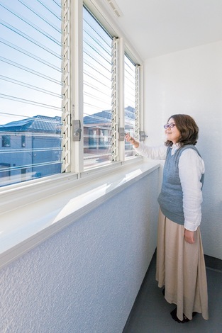 ご主人が花粉症なので 洗濯物は外に出さず サンルームで室内干し ルーバー式のサッシが光と風を通し 乾きも早い イエタテ